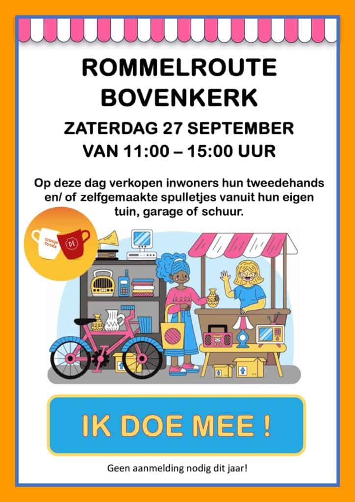 Het wordt weer een en al gezelligheid in Bovenkerk, voor iedereen die het leuk vindt om op koopjesjacht te gaan! Is er op zaterdag 27 september van 11.00 tot 15.00 uur een Rommelroute in Bovenkerk. Op deze dag verkopen inwoners hun tweedehands en/of zelfgemaakte spulletjes vanuit hun eigen tuin, oprit, garage of schuur.