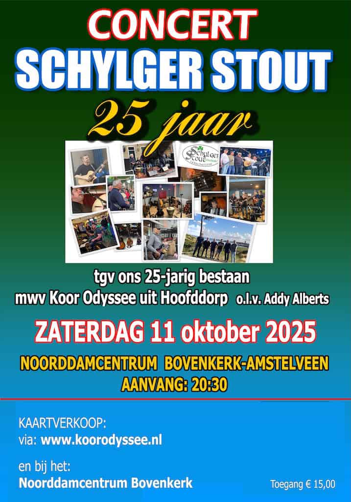 Op zaterdag 11 oktober komen we met de Terschellinger band Schylger Stout, waar ik als oud-Bovenkerk deel van uitmaak, ons 25-jarig bestaan vieren met een concert in het Noorddamcentrum te Bovenkerk, en dat i.s.m. Koor Odyssee uit Hoofddorp (waarin ook een paar oud-Bovenkerkers is meezingen)