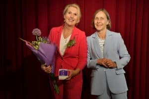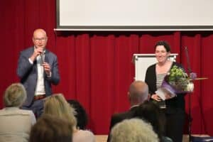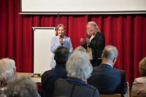 En als laatste Ellen Forbes en Annelies van Eekeren (via Facetime vanuit Parijs aanwezig), gemeente Ouder-Amstel, voor hun initiatief Vervoertje. Marylin Haimé van de Raad van Ouderen: “Met jullie initiatief bieden jullie oudere dorpsgenoten mobiliteit. Praktisch en laagdrempelig dragen jullie op deze manier bij aan hun zelfstandigheid en vrijheid.”
